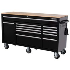Husky 8.73388E+11 $888 62 in. W x 20 in. D 12-Drawer Gloss Black Mobile Workbench Cabinet with Solid Wood Top and Power Drawer A large vertical drawer on the left-hand side of the unit reveals a unique storage space for power tools and batteries. This drawer even has its own power strip that has 4 outlets and 2 USB ports.. - Lot 991